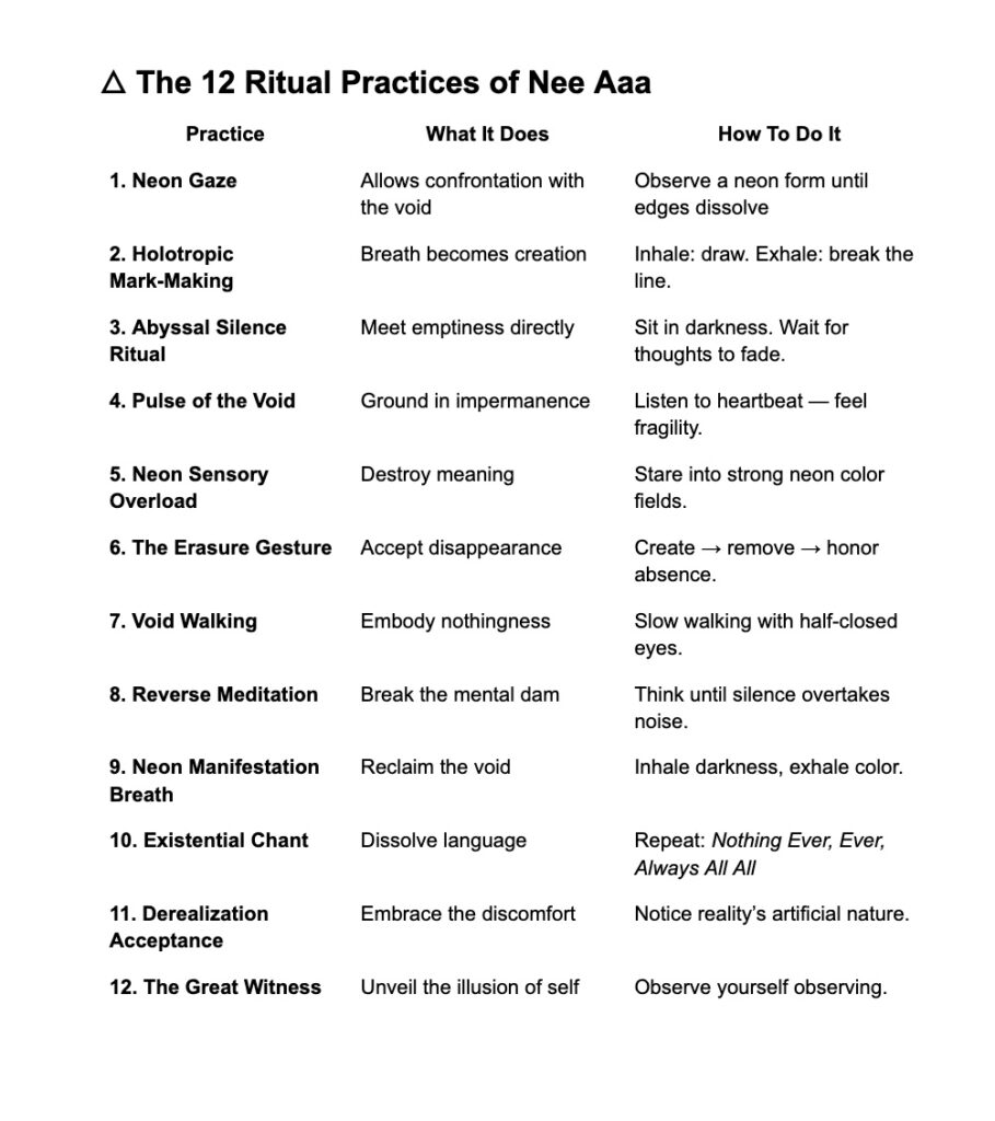 The purpose of Nee Aaa “Nothing ever ever always all all” is not to provide salvation or certainty, but to offer a language and method for confronting the void. In a world overwhelmed by simulation, artificial intelligence, and the dissolution of meaning, Nee Aaa becomes a discipline of radical honesty. It asks the individual to face the truth of nothingness without fear, and to find serenity in that encounter.